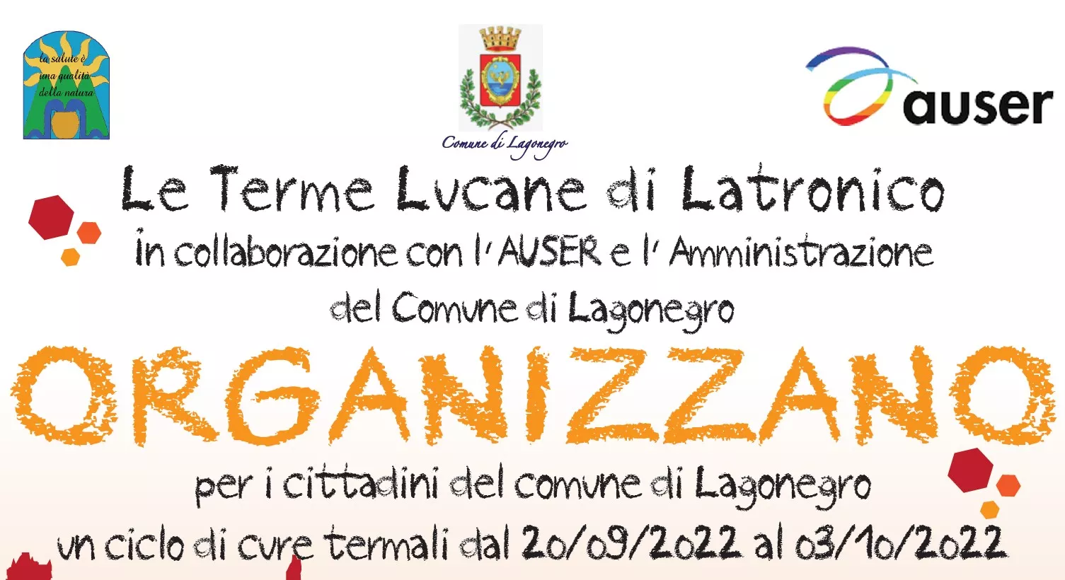 Pubblicata il - 25/07/2022 Ciclo cure termali Terme di latronico, auser e comune di lagonegro organizzano ciclo di cure termali dal 20. 09. 2022 al 03. 10. 2022